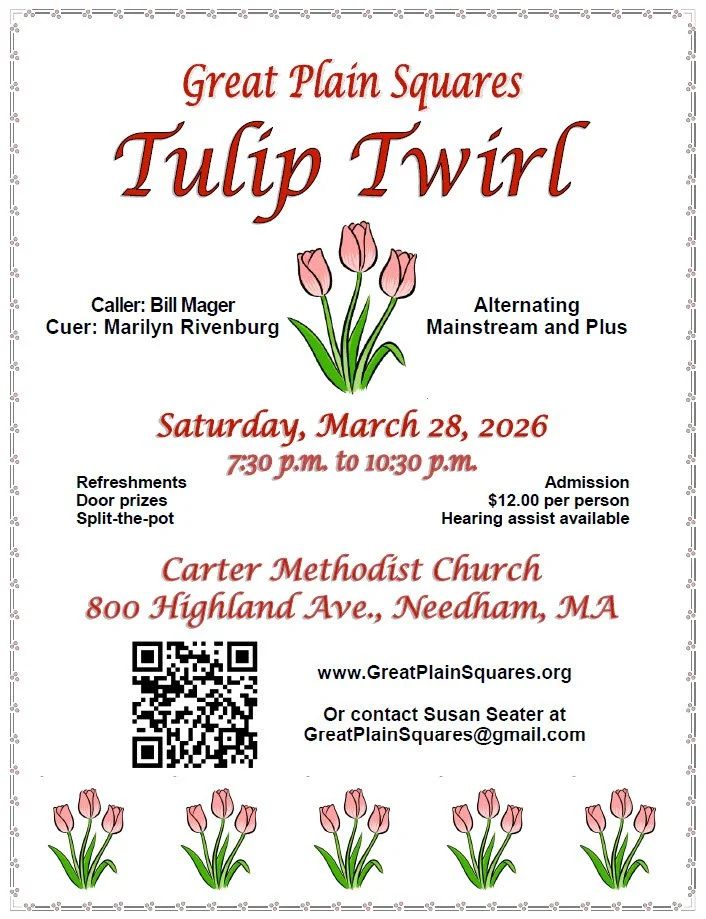 Get back some of that spring in your step and shake off the winter blues. Please join us at the Great Plain Squares Tulip Twirl dance and celebrate the coming of spring.