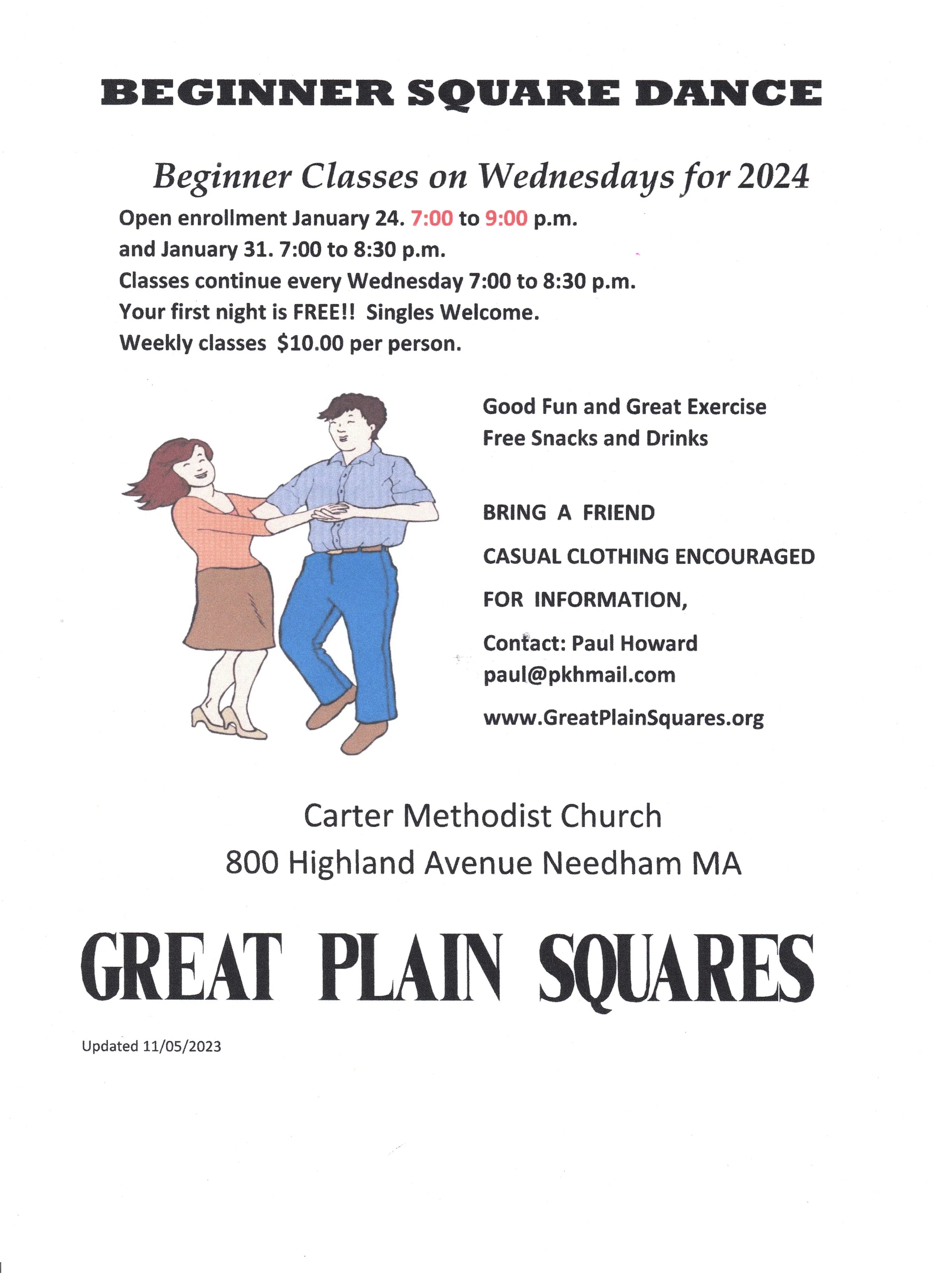 Save gasoline and burn energy. Learn to square dance at your local square dance club. It is a great way to have a fantastic evening out while getting exercise. Great Plain Squares of Needham, MA will teach you all about square dancing. On September 13, 2023 we will have a fun night to introduce you to square dancing. Join us at 7:00 p.m. as we welcome you to our world of square dancing.